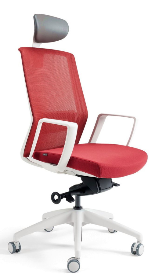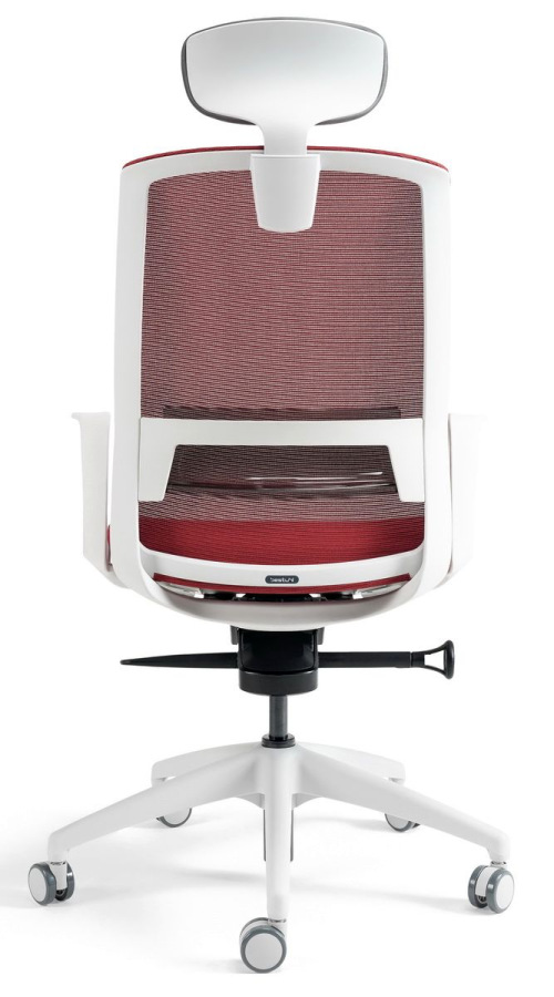 Kancelárska stolička BESTUHL J17 WHITE v bielych farbách konštrukcie a plastov s nastaviteľným podhlavníkom, s priedušným operákom chrbta potiahnutým jemnou sieťovinou - soft touch mesh a anatomickou bedrovou opierkou v prevedení z priesvitného dymového plastu.